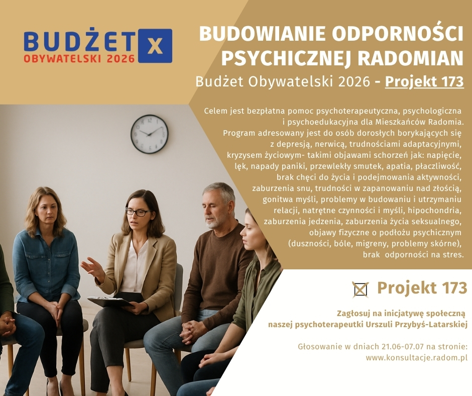 17.06.2025 Dobry psychoterapeuta w Radomiu przedstawia projekt nr 173 w Ramach Budżetu Obywatelskiego 2026