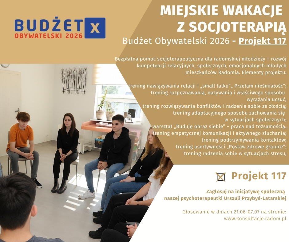 20.06.2025 Dobry psychoterapeuta w Radomiu przedstawia projekt nr 117 w Ramach Budżetu Obywatelskiego 2026