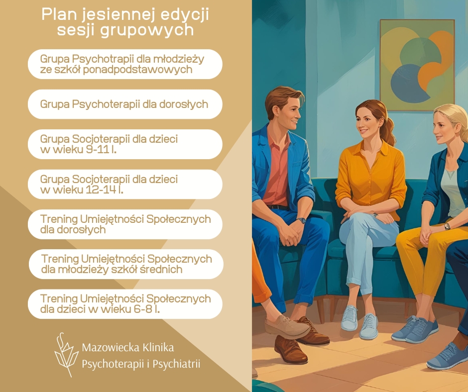 Zapraszamy dorosłych Pacjentów do udziału w grupach terapeutycznych. Obecnie prowadzimy nabór do następujących grup:
